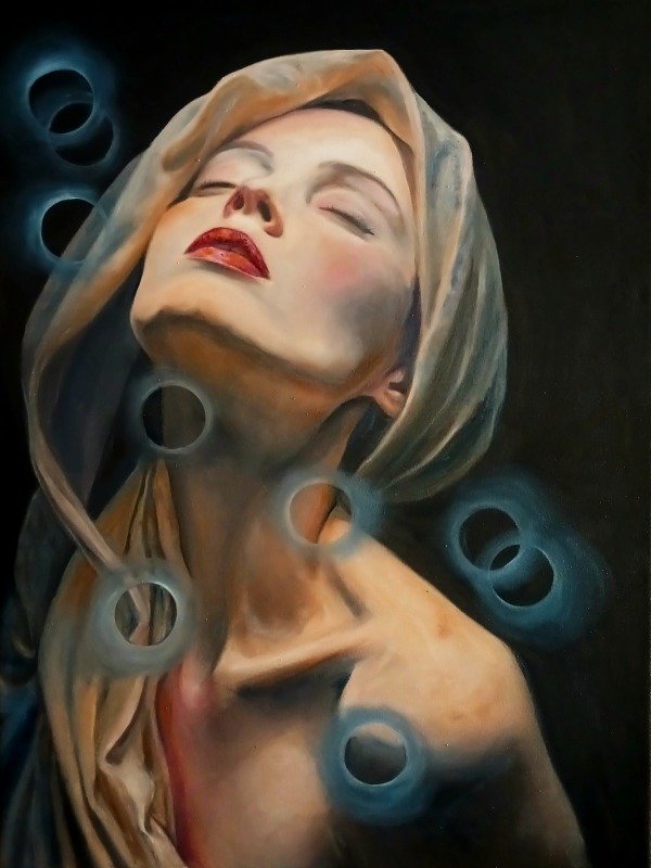 "Círculos interiores" es una exploración de la intimidad femenina, de sus pulsiones más silenciosas y profundas. La figura central, una mujer con el rostro elevado, los ojos cerrados y el gesto entregado, evoca un estado de éxtasis introspectivo, de conexión con lo sagrado y lo propio. Envuelta en un velo translúcido, se representa tanto contenida como libre, habitando el espacio entre la vulnerabilidad y la fuerza.