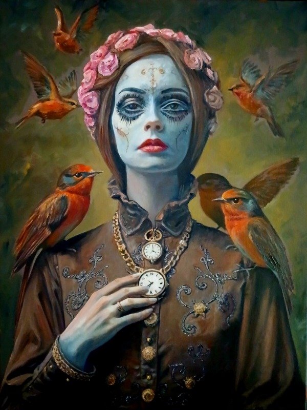 El maquillaje y la palidez de su piel refieren a una dimensión espiritual, a una conciencia que trasciende lo físico. Nos habla de la conexión con el misticismo, con la tradición y con la introspección. Los pájaros, como símbolo de libertad y sabiduría, rodean su figura, sugiriendo que la mujer es portadora de conocimiento, un puente entre lo terrenal y lo divino.