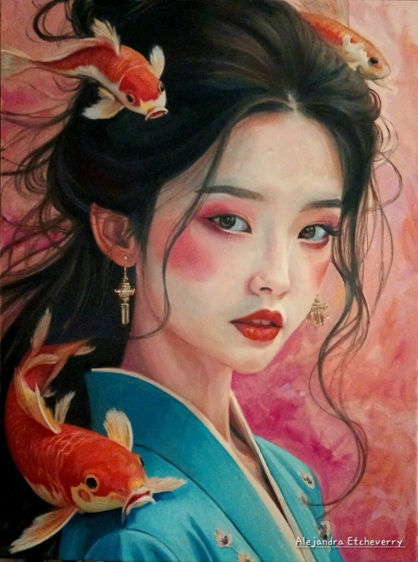 Evocando la fusión entre lo femenino, lo espiritual y lo simbólico del pez Koi como emblema de elegancia, fuerza interior y trascendencia.