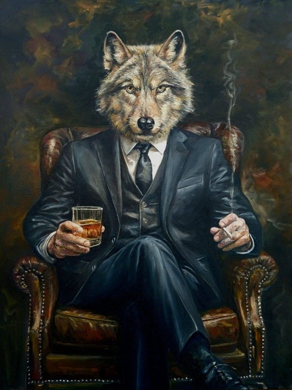 En La Estrategia de la Sombra, el lobo se convierte en el emblema del poder racional y calculador: el depredador que ya no necesita la violencia abierta para dominar, sino que ejerce su control desde la discreción y la apariencia. Sentado, vestido de traje, observa desde la penumbra con la calma de quien ya conquistó el terreno.