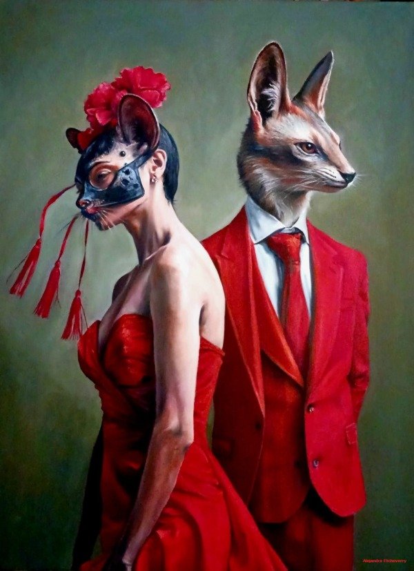 El poder de la seducción y la manipulación. La imagen de una pareja con vestimenta impecable, pero con rasgos animales, sugiere que la persuasión y el engaño son tan efectivos como la fuerza bruta. Aquí, el dominio no se ejerce con violencia, sino con estrategia, deseo y atracción, encarnando las estructuras de poder que operan bajo la ilusión de la voluntad propia.
